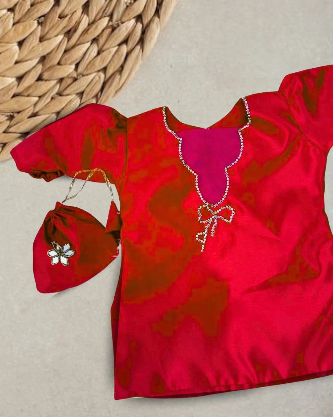 This red short shirt is beautifully adorned with delicate embroidery and elegant lace detailing, adding...
